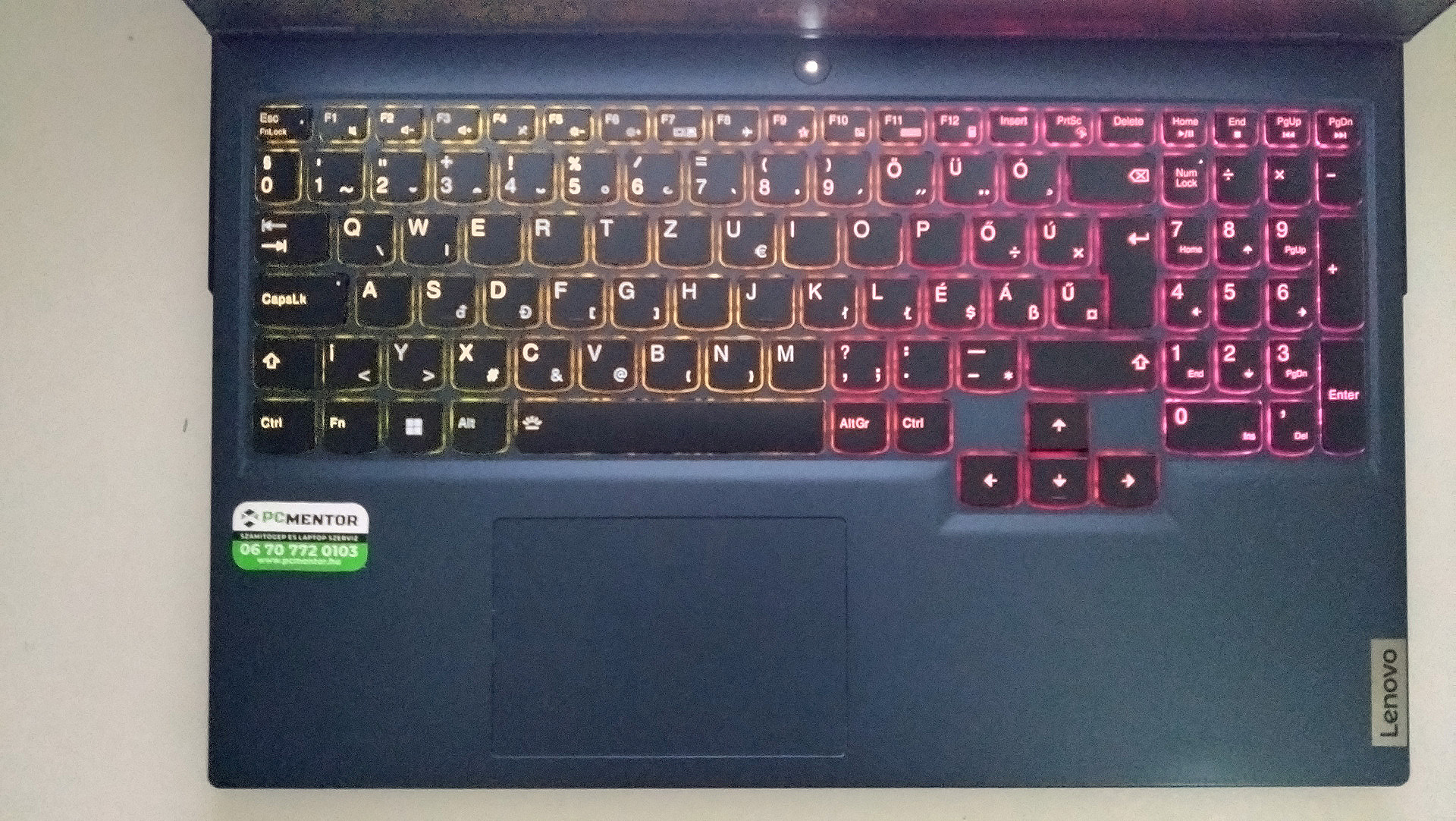 Így néz ki a magyar kiosztású billentyűzet sötétben, bekapcsolt háttérvilágítással(sötétben sokkal jobban olvasható):